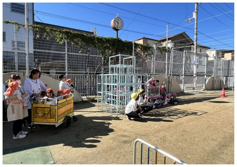 給食室からの出火という想定で、潮江児童遊園まで避難しました。