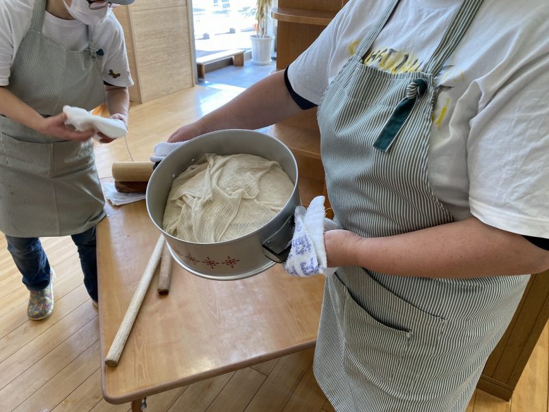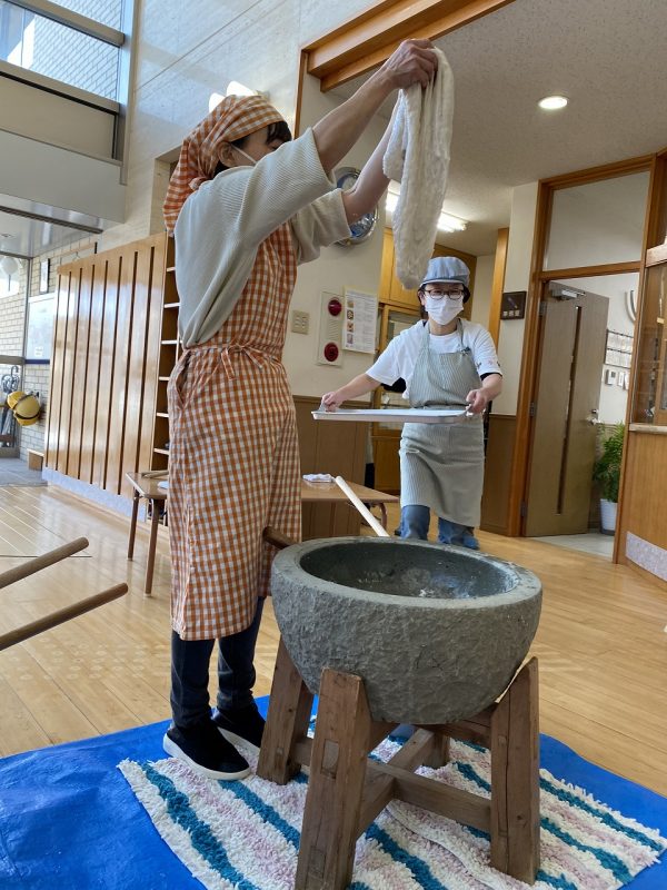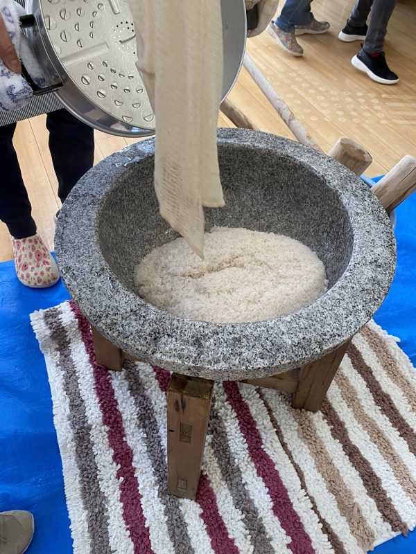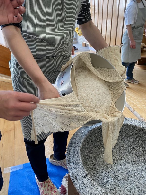臼に入れたもち米を、杵に体重をかけて潰していきます😊(ここがポイント!!)