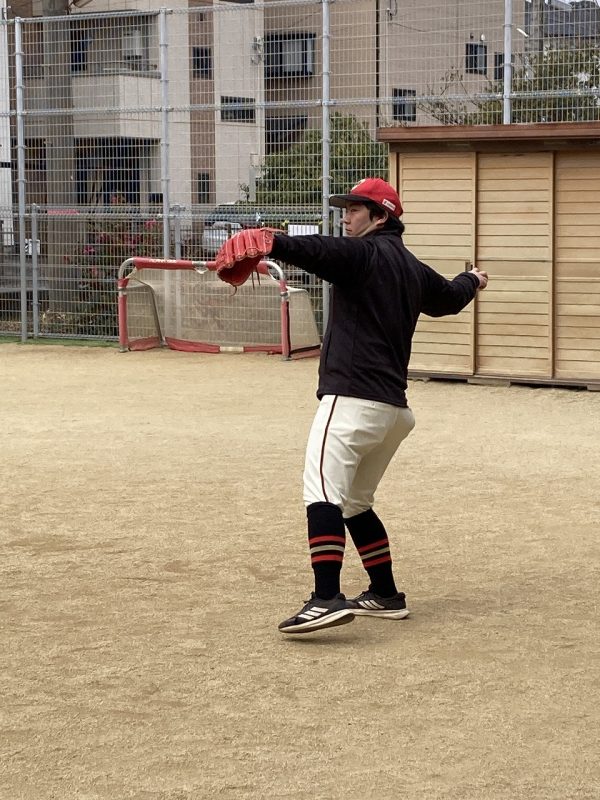 ますは、足をパーに開き、投げる方向に手を伸ばします。