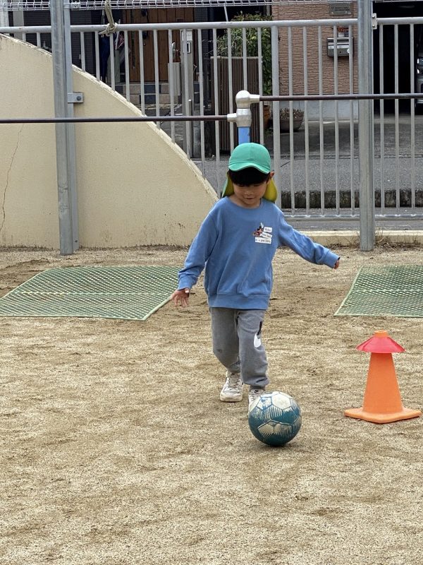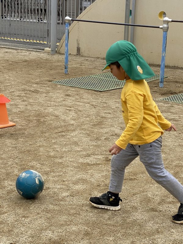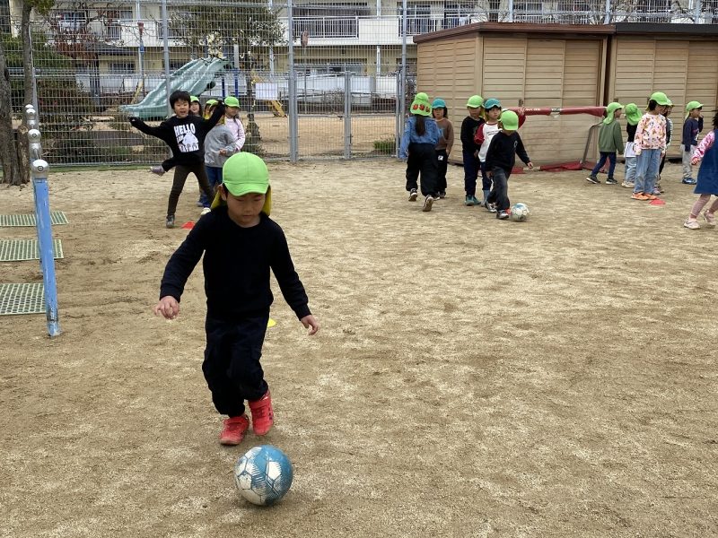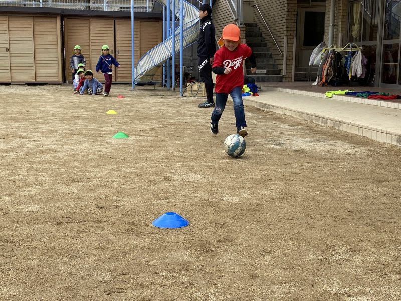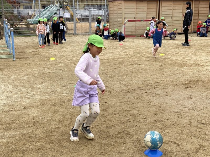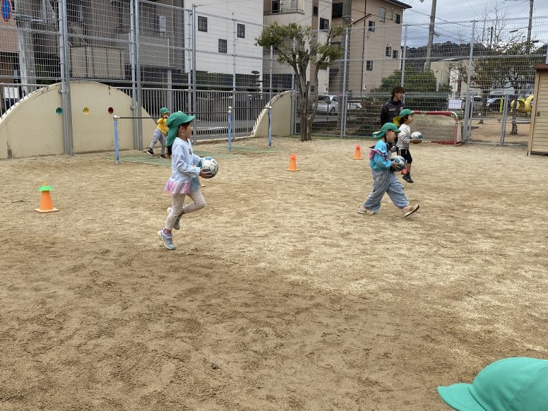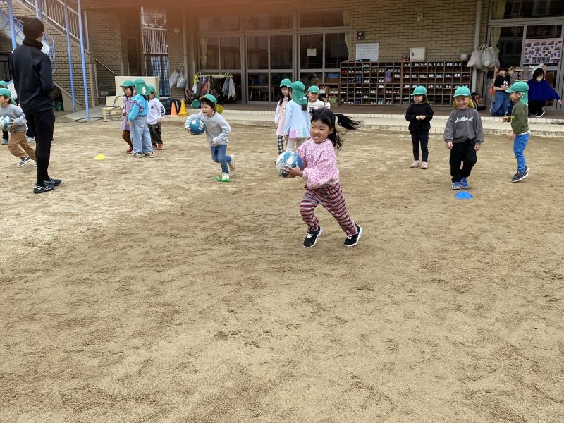 今日は、4,5歳児対象で、高知ユナイテッドSCのコーチが2名来園し、サッカー教室がありました。
